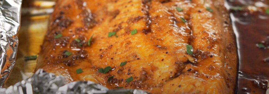 3. Рыбу выкладываем на противень с фольгой. Солим, перчим по вкусу и поливаем соусом.