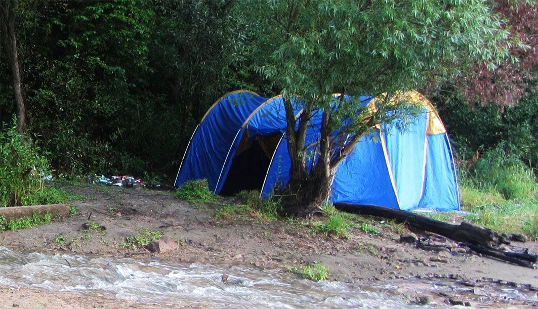 Мы с Николаем Николаевичем приехали к берегу реки Волхов в пятницу поздно вечером. Вокруг было захламлено нашими предшественниками: банки, бутылки и рваные полиэтиленовые упаковки набросаны кругом. Мы всё сгребли в одну кучу и тогда появилось место поставит наш шатёр.
