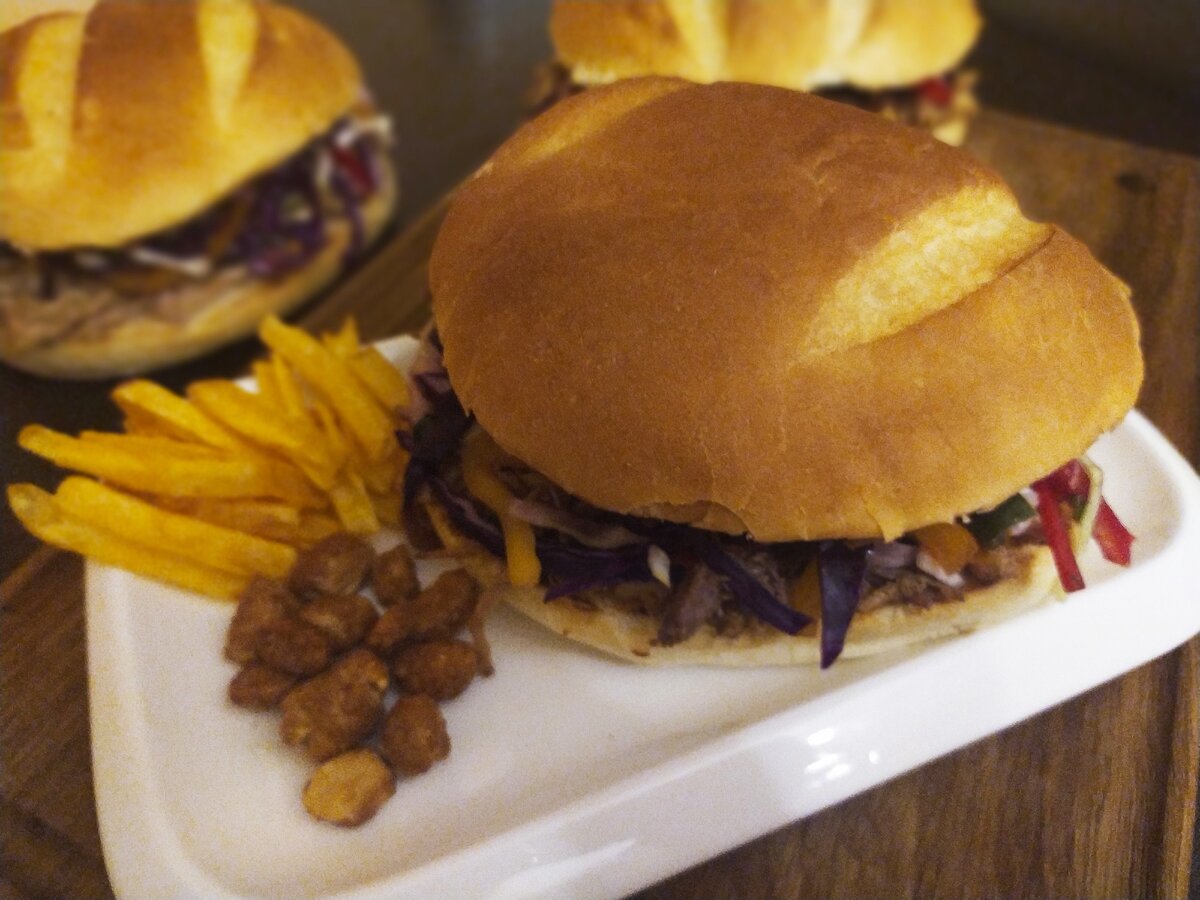 На нижнюю часть булочки выкладываем свинину, сверху салат и немного соуса. Накрываем верхней булочкой.