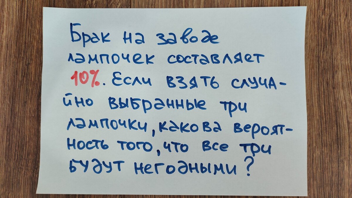 Задача не такая тривиальная, как кажется, потому что не сказано, из какого количества мы выбираем три случайные лампочки. Может быть из 10, может быть из 100, а может быть из 1 000 000. Ответы получатся разными. Однако, так как эта задача не с экзамена, а с собеседования, и рассчитана на быстрый ответ, высокая точность ответа не так важна, важна логика решения.