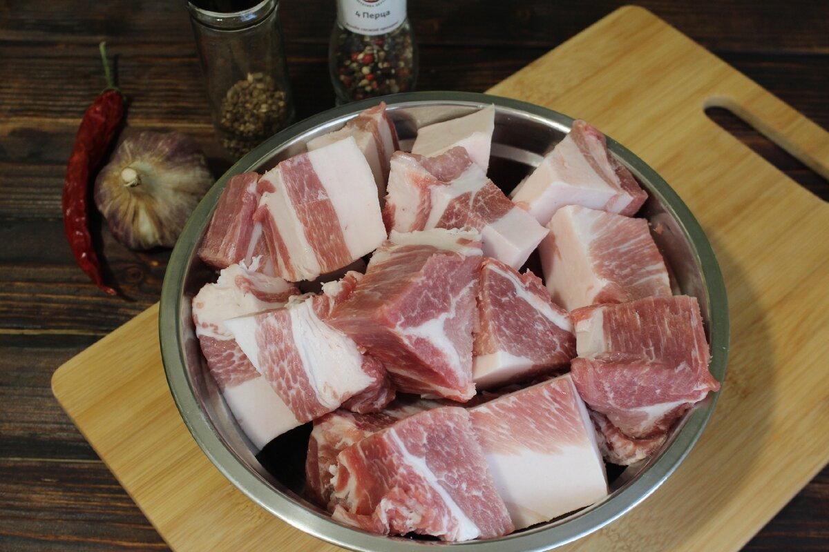 Свинину на такую колбасу лучше взять пожирнее. Если кусок мяса постный, допустим корейка, добавить к нему грамм 100 сала.
