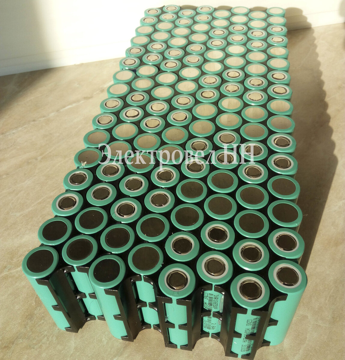 На снимке еще одна подобно собранная батарея. Сопротивление токопроводящей части (никелевых соединений) было превышено в 9!!! раз. Нам принесли ее в ремонт, поскольку при старте с места на велосипеде мощностью 1,5 кВт напряжение батареи проседало на целых 11 вольт и велосипед был очень вялым. Батареи хватало на 5-10 км. Питание просто вырубалось.