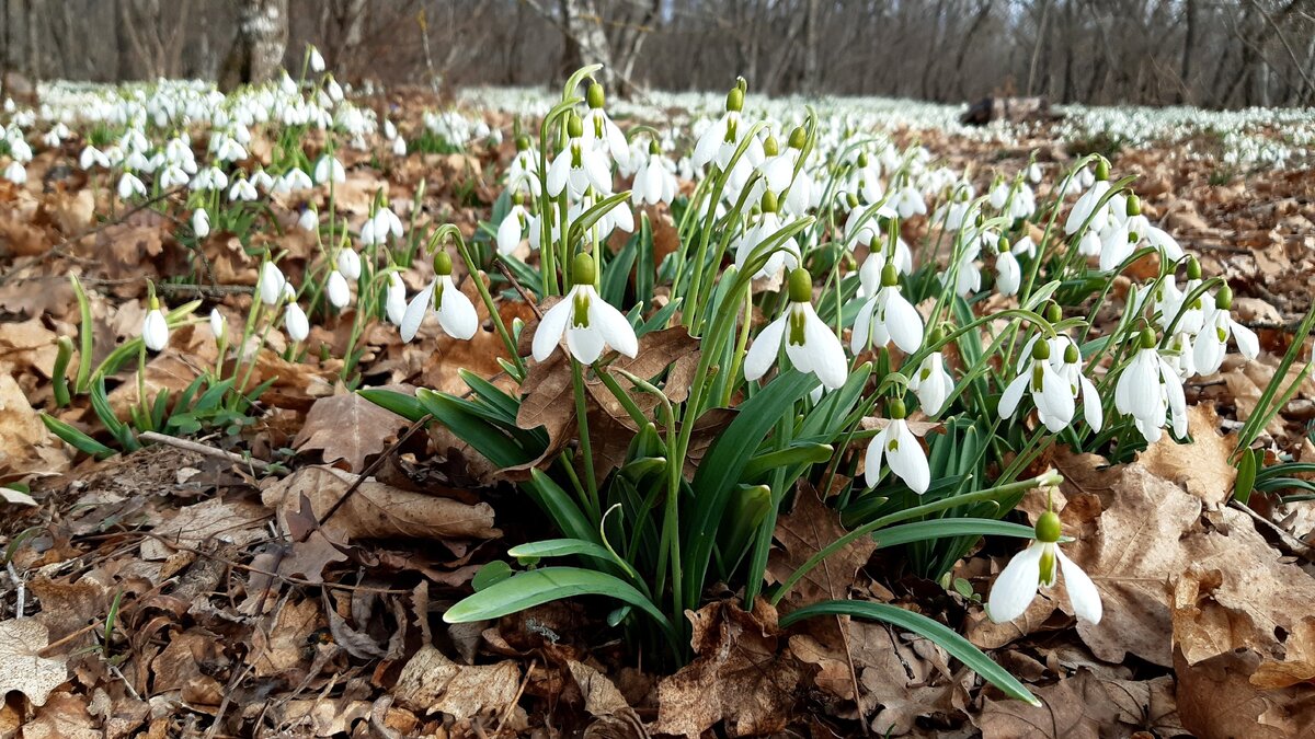 Обычно цветет крымский галантус в феврале-марте. Но, например, в этом году начал цветение еще в декабре, прекрасно перенес февральские снегопады и морозы, и сейчас его цветение в самом разгаре. Мы на днях ездили смотреть как достраивают Бельбекский водозабор, заодно неподалеку прогулялись по лесу, где великолепные поляны подснежников и навели нас на мысль написать об этом цветке.