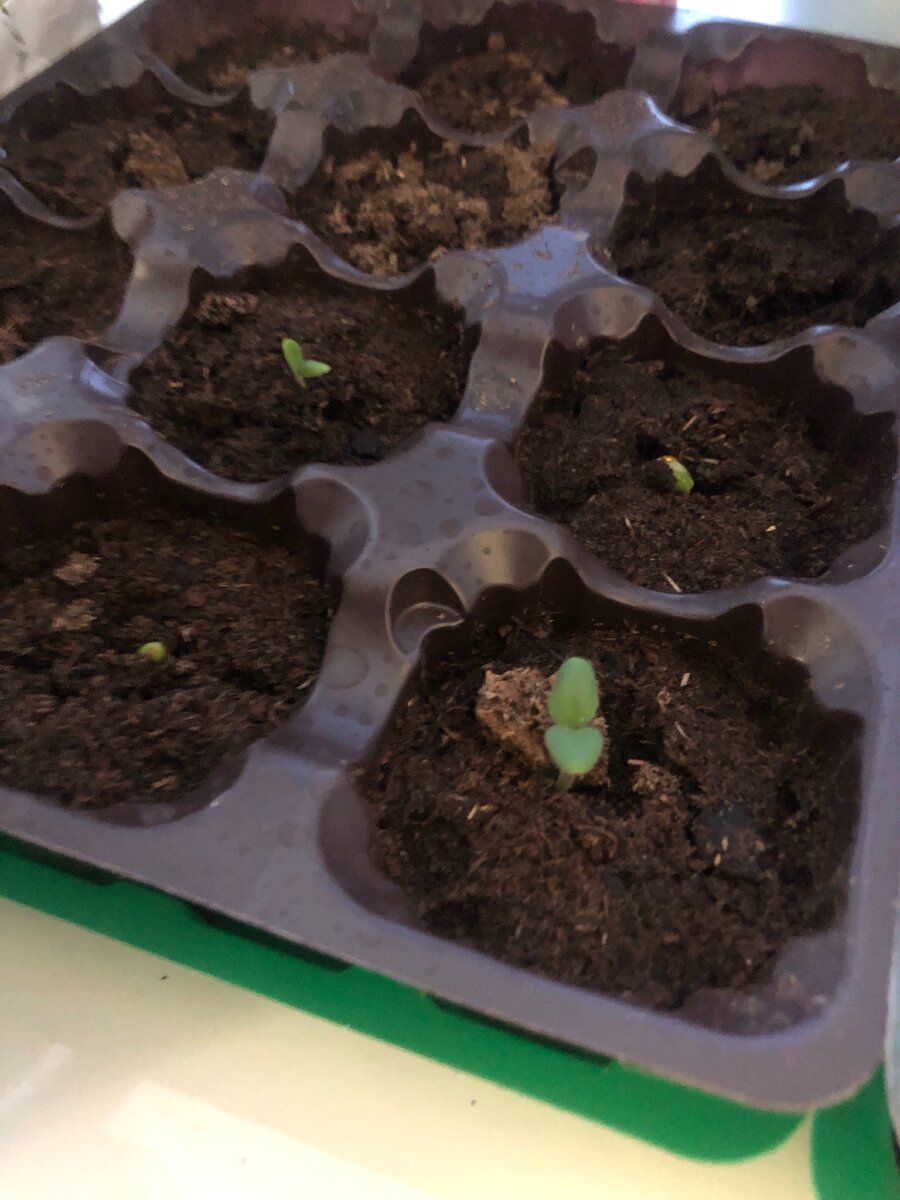 Первая взошла, конечно же, герань. Посажена в субботу, первый росточек уже во вторник.