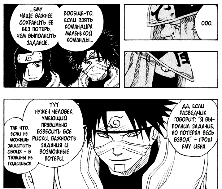 С Наруто и так всё ясно. У этого человека возникают порой гениальные планы, но это лишь его собственная хитрость, а не лидерские качества. Лично я считаю, что очень справедливо, что этот человек так и остался "пожизненным" генином, а ранг повышал "блатным" методом в конце истории. Будучи Хокаге - он обретёт достаточный уровень мудрости, который попросту был наработан опытом, а вот все события 1 и 2ого сезона сводятся к тому, что Наруто достигает каких-то нереальных источников силы(сен-мод, контроль над лисом), благодаря чему имеет возможность решать всё в одиночку, не нуждаясь в команде. Решать, что делать, как поступить, кто в какую точку встанет, чем пожертвовать и т.д - он бы не смог(до зрелого возраста).