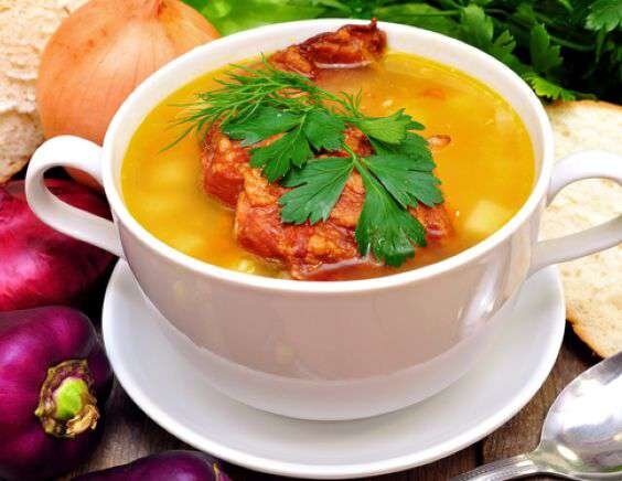 - В гороховый отвар долить воды. Добавить овощи с беконом и дать закипеть.