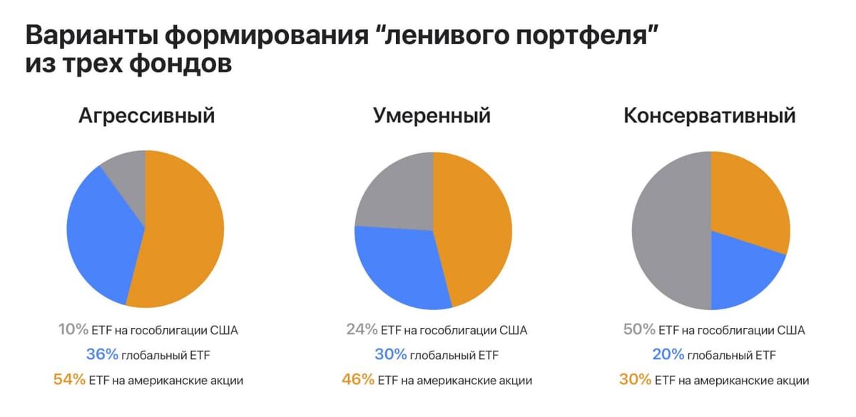 На что действительно стоит обратить внимание при выборе ETF, так это на на размер комиссии за управление, а после покупки — не забывать проводить их ребалансировку в портфеле, то есть следить за соблюдением выбранного вами процентного соотношения между тремя фондами (наиболее популярные варианты показаны на картинке ниже).