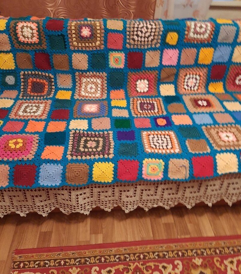 Навязав крючком солидную партию больших и маленьких квадратов, мама соединила их и ... вуаля!... все готово. Занятие кропотливое, затратное по времени, но того стоит!