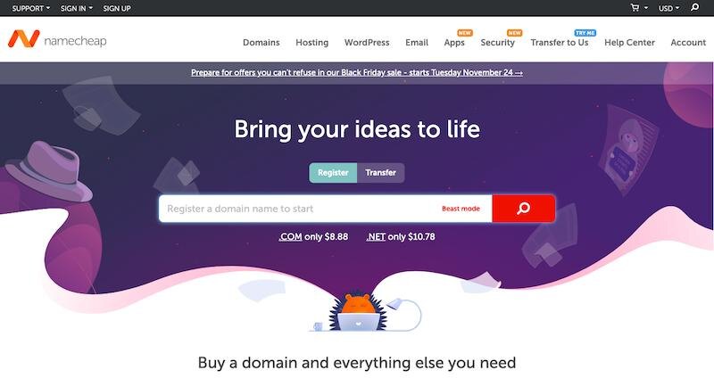 Namecheap — регистратор доменов, аккредитованный корпорацией по управлению доменными именами и IP-адресами (прим. пер.: ICANN), который поможет купить выбранное вами доменное имя. Также он позволяет перенести ваше доменное имя, если оно было зарегистрировано где-то в другом месте. При этом автоматический перенос вашего домена займет не более 30 минут.