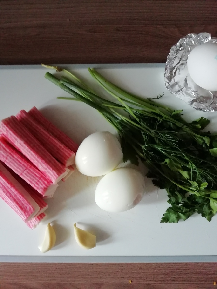 Для начала натираем на крупной тёрке крабовые палочки и яйца.