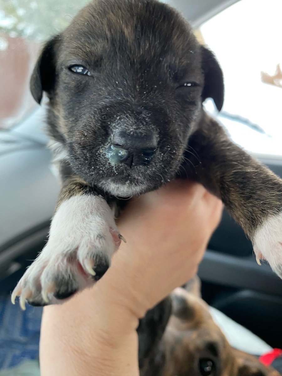 Бахати и ее щенки благополучно добрались до Перми и находятся на передержке. Из трёх щенков оказалось два парня и пестрая девочка. Девочка самая маленькая и хиленькая, из носа шли сопли зелёного цвета. Малышку показали врачу, назначили курс антибиотиков и Циклоферона.
