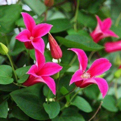 Клематис «Принцесса Диана» даже на фото действительно очень красив. На фоне изумрудной листвы многочисленные цветочки играют малиново-розовыми переливами: от искристого, сверкающего, насыщенного цвета в самой глубине, до нежного оттенка пера фламинго по краю внешней стороны лепестков. Цветы имеют форму небольших (до 7 см в диаметре) «колокольчиков», бодро тянущихся вверх. Четыре остроконечных лепестка расположены крестообразно. Тычинки и пыльники бывают белыми, кремовыми или светло-желтыми.