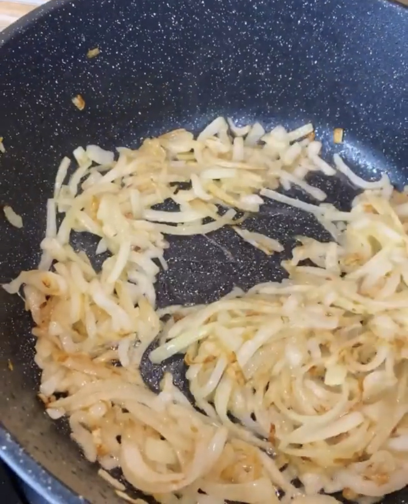 Положить лук и, помешивая, обжарить его до темно-золотистого цвета, 5-7 мин.