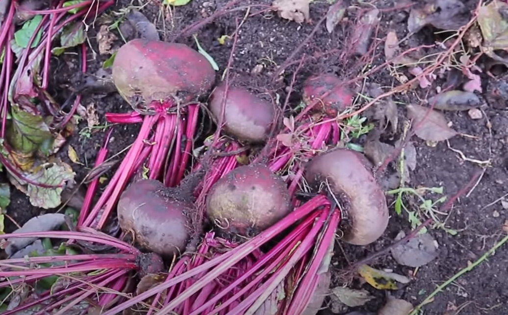 Начну с лидера. И лидер это свекла Египетская. Самые крупные корнеплоды, плоско-округлые. Вот такого вот размера хорошего. Древнейший просто сорт, наверно прямиком из Египта еще к нам попал. И вот как хорошо он себя показывает из года в год на разных участках. Он меня радует отличной урожайностью и неприхотливостью.