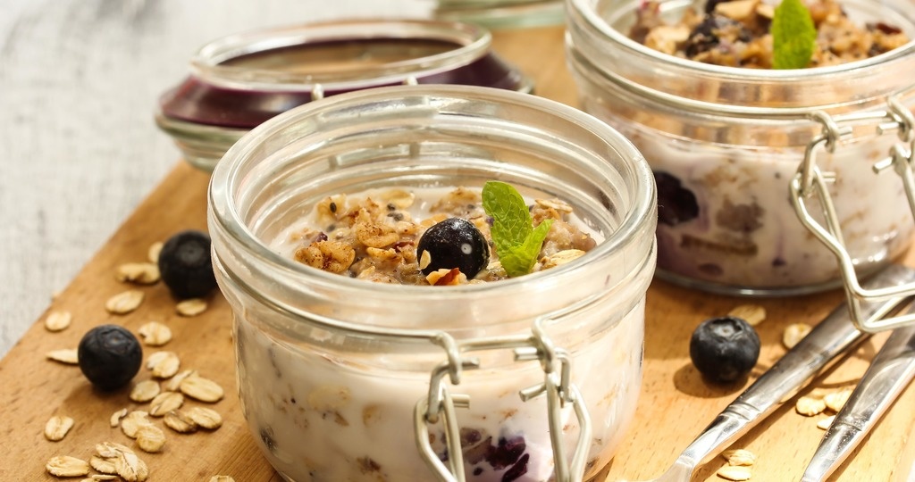 Смешать миндальное молоко и овсяные хлопья в миске. Выложить в маленькие баночки, накрыть крышкой и поставить в холодильник на ночь.