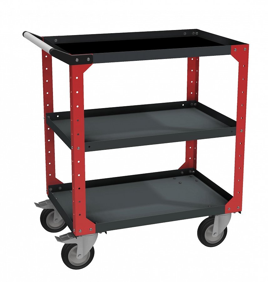 Инструментальные тележки для автосервисов, автомастерских, гаражей. Максимальная нагрузка на ящик — 50 кг, на тележку — 300 кг. Все колеса поворотные, два из них с тормозом. Диаметр колеса — 125 мм. Три цветовые комбинации: антрацитово-серый RAL 7016 + агатовый серый RAL 7038, + голубой RAL 5012, + транспортный красный RAL 3020. Гарантия — 3