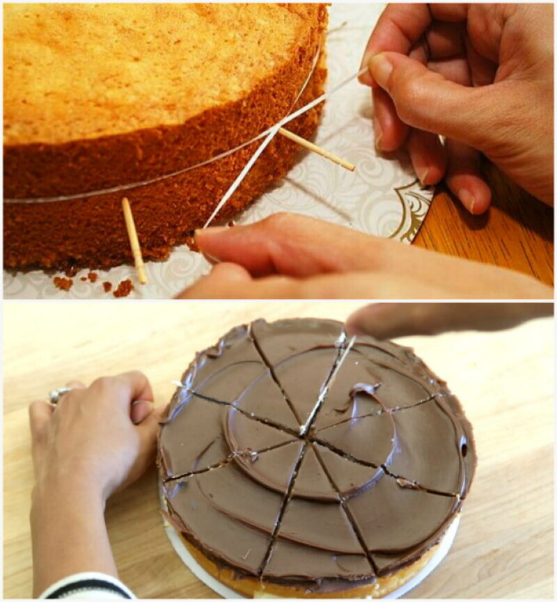 Мне показали очень интересный способ нарезать мягкий торт или пирожное. Он позволяет совершенно не сдавливать крем или глазурь верха кондитерского изделия, и края разреза выходят почти идеальными. Теперь я им пользуюсь при удобном случае.