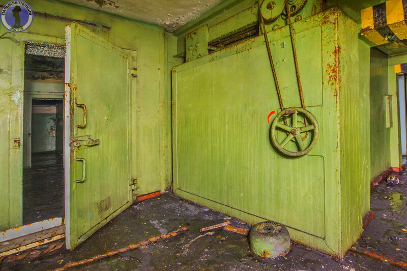 А вдоль главного коридора по обе стороны идут входы в помещения, защищённые толстенными сейфовыми дверями.