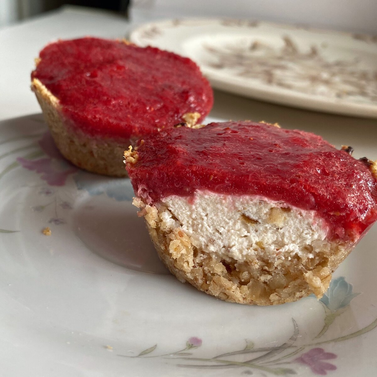 2 Для начинки в чаше блендера смешала белок, творог и финики. Тесто выложила в силиконовые формочки, сформировала корзиночки. Сверху начинку. В духовку на 180С- на 25 минут