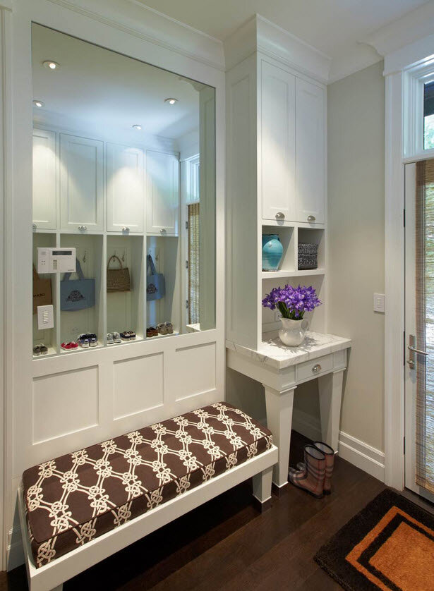 Она есть, и в то же время создаётся ощущение её отсутствия. Плюс к тому зеркальная стена может скрывать за собой рабочую зону и добавлять комнате много света.