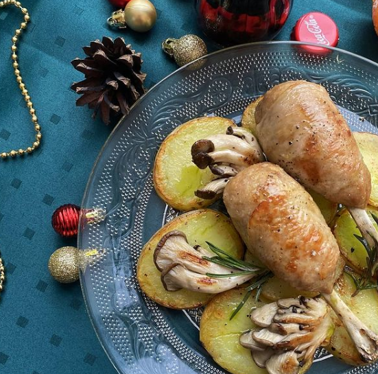 Сочные куриные котлетки на косточке с ломтиками ароматного картофеля и грибами.
