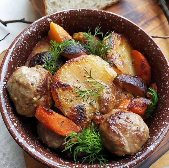 4) В одну емкость выложить отварную картошку и остальные овощи, сверху выложить митболы, добавить немного воды, в которой варилась картошка, добавить немного соевого соуса (по желанию). ⠀⠀