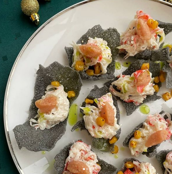 РИСОВЫЕ ЧИПСЫ с сурими, нежным сырным кремом и икрой трески. Блюдо №1.