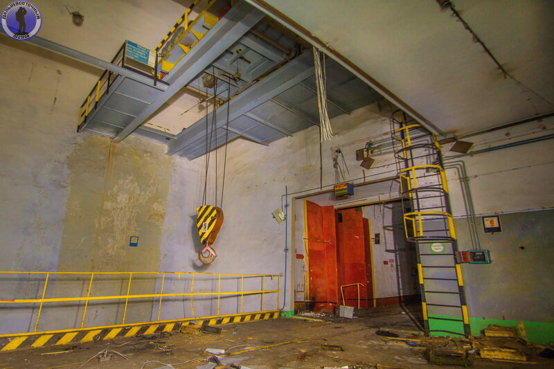 Слева видна грузовая шахта для подъёма и спуска в хранилище ядерных боеголовок, чуть дальше у стены виден спуск для личного состава, а сверху мощный кран.
