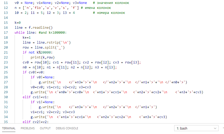 g . write ( ' \n <' + n0 + '>' + cv0 + ' \n <' + n1 + '>' + cv1 + ' \n <' + n2 + '>' + cv2 + ' \n <' + n3 + '>' + cv3 ) - Когда обработка дублирующихся колонок завершена, записываем в выходной файл остаток исходной строки