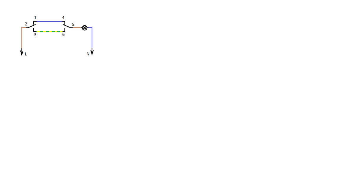 Провод, идущий от выключателя используется трёхжильный, поэтому я выбрал цвета, исходя из реальных. Вместо белой жилы я использовал коричневый цвет, потому что пишу на белом. Жёлто-зелёный, синий, коричневый – такая расцветка тоже существует. Для того, чтобы меньше путаться, какие провода соединять в распределительной коробке, наиболее удобный вариант следующий: от каждого выключателя приходят три цвета; синий жёлто-зелёный, коричневый (или белый, красный, чёрный). Соединяются друг с другом жёлто-зелёные и, отдельно синие провода. Оставшиеся коричневые идут на фазу питания и светильник. «Ноль» питания также уходит на светильник. Такой способ работы с цветами позволяет с большей вероятностью избежать ошибок в соединениях.