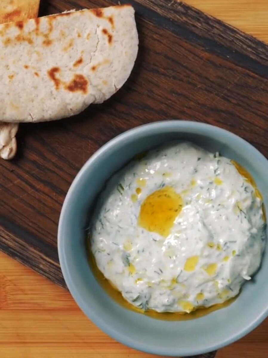 В греческий йогурт добавляем огурец, который перед этим хорошо отжимаем от влаги, и зелень с чесноком.