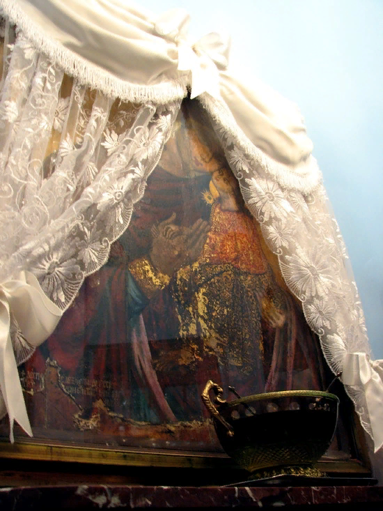 Икона находится в небольшой, богато украшенной часовне в правую сторону от монастырской церкви. Чудотворная икона помещается на восточной стене в золотом киоте на мраморной доске с небольшим углублением, в виде блюда, для истекающего по временам от иконы святого мира.