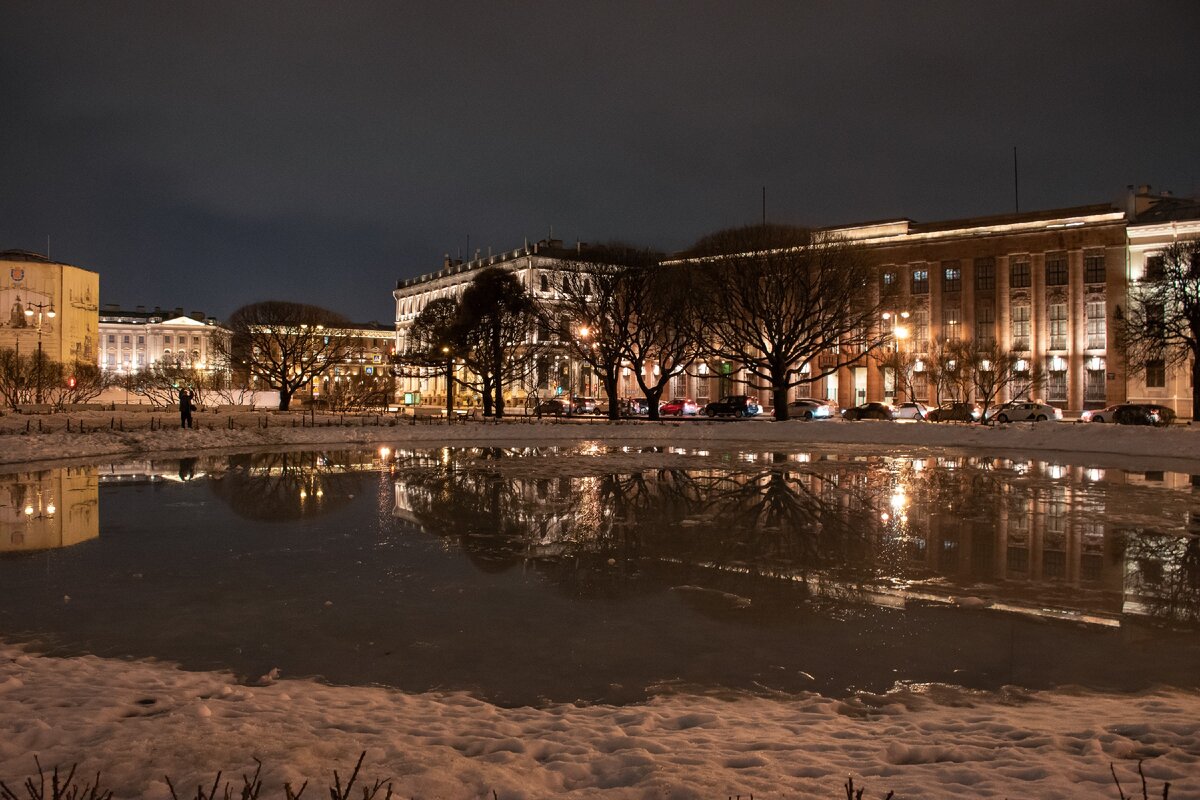 После сильных морозов в Санкт-Петербурге установилась длительная оттепель. Снег растаял, на месте газонов появились лужи. Но этот город прекрасен в любую погоду.