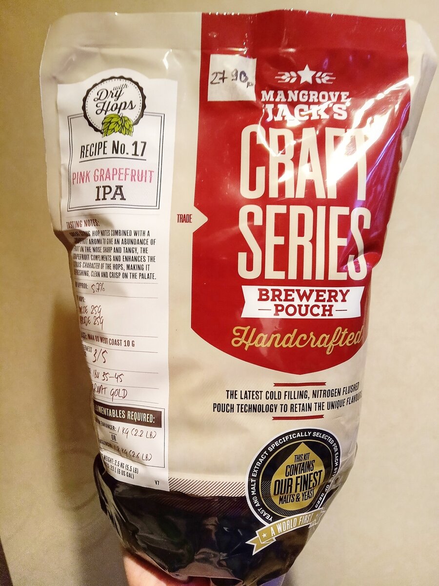 С продукцией новозеландской компании Mangrove Jack`s я знаком довольно давно - когда-то делал пиво из их концентратов. Однако там были стандартные сорта пива (лагер, пилзнер, эль, стаут и т.д.), которые быстро наскучили. А сейчас, как я погляжу, у них появилась крафтовая линейка пива с довольно интересными видами пенного. Так что взял парочку на пробу. И первым решил сделать Pink Grapefruit IPA. Как можно понять по названию, это IPA со вкусом/запахом розового грейпфрута. Что это такое, я не в курсе - обычный грейпфрут ел, красный ел, а про розовый даже и не слышал. Ну ладно, попробую пиво и узнаю, каков на вкус сей фрукт. В комплекте, кроме собственно концентрата и дрожжей, имеется еще и пакетик с хмелем для сухого охмеления - по 25 грамм Симко и Каскада. Охмелен ли сам концентрат, и если да, то чем, не написано. На сайте производителя пиво описано так: Вдохновленное цитрусовым IPA Elvis Juice от Brew Dog, пиво содержит великолепные нотки цитрусового хмеля в сочетании с ароматом грейпф