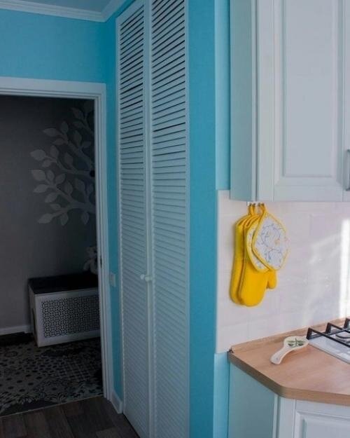 Кухня, о которой сегодня пойдёт речь, понравилась мне ещё со входа. Хозяева интересно продумали момент с пустой стеной, которую обычно никто не использует, и сделали там небольшую кладовку.