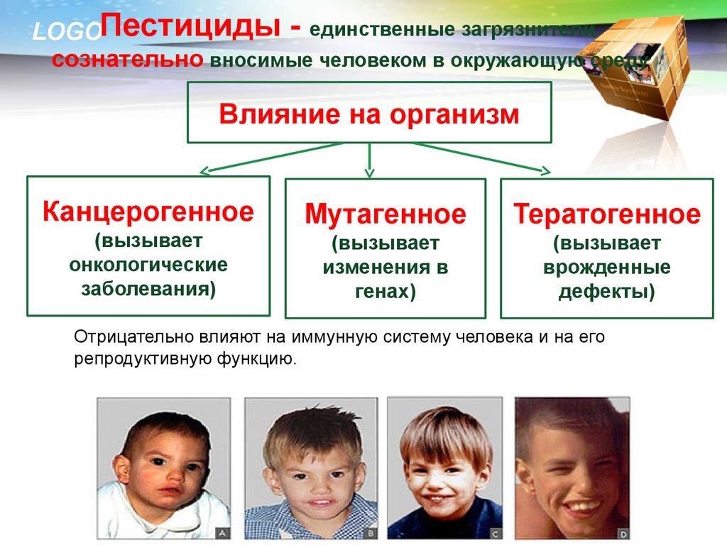 Взрослым , подвергшимся влиянию пестицидов , грозят 3 основных последствия : рак , нарушение репродуктивной способности (начиная от стерильности и бесплодия , и кончая пороками развития , выкидышами и рождением мертвого ребенка ) и воздействие на мозг и центральную нервную систему (нейротоксичность ).