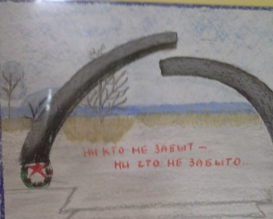 Рисунок, хоть и явно не дошкольника, очень даже хороший. Изобразили мемориал в Коккорево на берегу Ладожского озера, он так и называется: "Разорванное кольцо". В общем, хорошая работа.