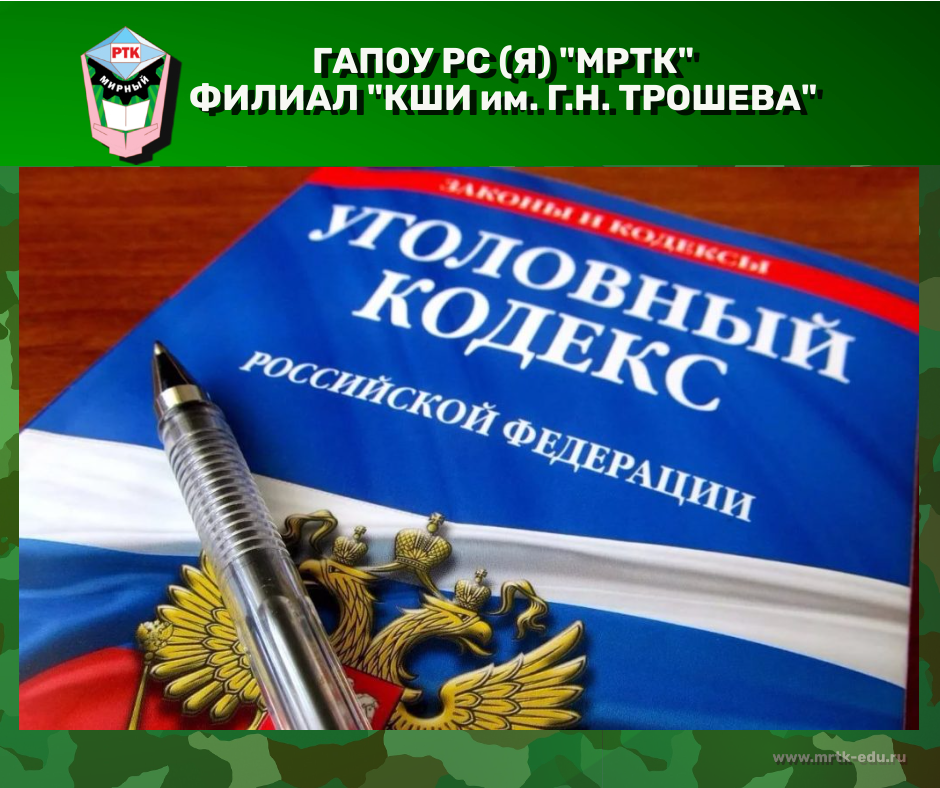 В филиале «КШИ им. Г.Н. Трошева» МРТК 2 марта 2021 года обучающимся дана информация об уголовной ответственности, с целью повышения правовой культуры, воспитания чувства ответственности за свои поступки, уважения к закону, законопослушания.