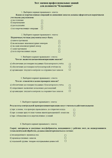 Хотел бы акцентировать Ваше внимание на том, что основная ответственность за разработку этого направления тестирования лежит на руководителе структурного подразделения, а в случае его отсутствия - на специально назначенном сотруднике, который обладает всей полнотой необходимых компетенций в силу своего профессионального опыта. Так как именно они (руководитель, ведущий специалист и т.д.) обладают достаточными знаниями всех внутренних процессов и процессов взаимодействия с другими сотрудниками, что и позволит им разработать эффективную систему профессионального тестирования. Само же тестирование и определение его результатов может проводиться и сотрудником отдела управления персоналом, если это технологически возможно (не требует выполнения операций на оборудовании и т.д.). Профессиональное тестирование осуществляется по нескольким основным направлениям. Во-первых, это профессиональные тесты. Они позволяют оценить объём профессионально-важных знаний. Разрабатываются по каждой отдельной должности (группе должностей, если они выполняют однотипную работу). Вариант такого теста может выглядеть так: