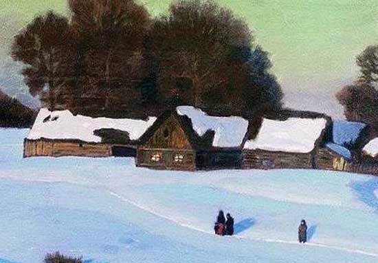Зима в российской глубинке всегда снежная, с метелями да буранами. Она идет по полям, лесам, сковывает реки и озера толстым слоем льда, нахлобучивает на дома белоснежные шапки, развешивает ожерелья из прозрачных сосулек. Красота да и только! Именно такую пору решил запечатлеть известный русский художник Николай Крымов на холсте.