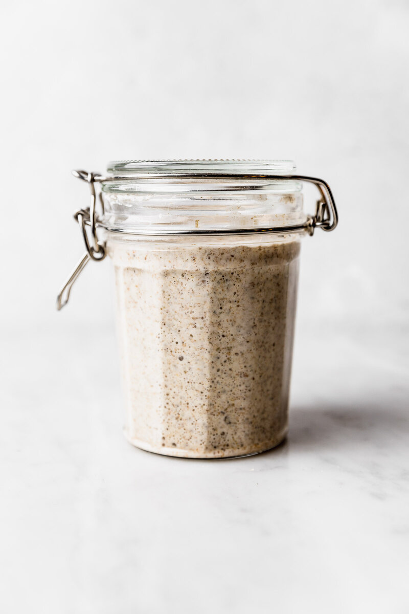 Это зависит от вас. Чего я обычно не рекомендую, так это кормить его только универсальной мукой. Универсальная мука содержит меньше питательных веществ, и, поскольку мы кормим живые существа, это влияет на качество ее ферментации. Обычно рожь быстрее сбраживает. Мне нравится использовать половину ржи, и половину - универсальной. Рожь похожа на стероиды для закваски. Она сохраняет активность, а также снижает риск того, что закваска станет излишне кислой или слишком быстро заферментируется. Если у вас нет ржаной муки, вы также можете использовать половину цельнозерновой и половину универсальной. Я не рекомендую вам использовать только рожь или только цельнозерновую муку, потому что в них меньше глютена, и он не задерживает достаточно воздуха при брожении, и поэтому труднее оценить активность, когда они увеличиваются в объеме.