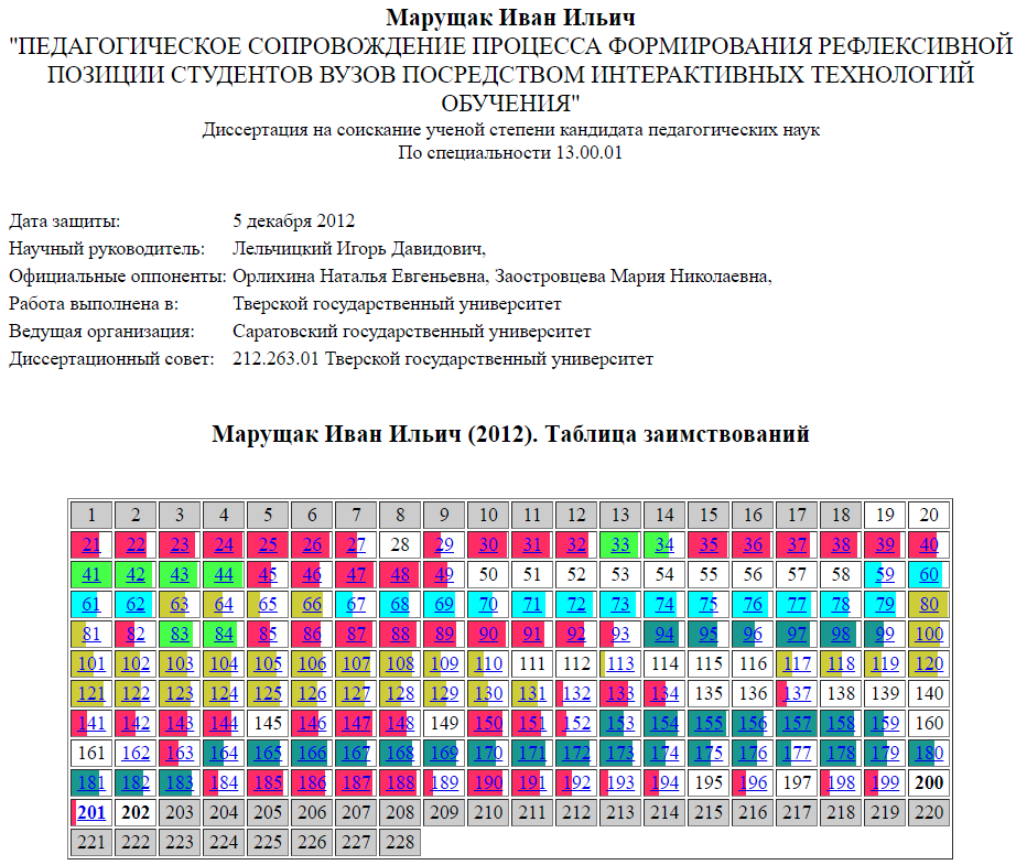 В тексте присутствуют ссылки на работы Е.В. Багдай, В.Т. Горбачева, Л.Б. Сабитовой и М.Б. Челышковой, однако их оформление не соответствует, по мнению эксперта сообщества, истинному объему заимствований. Текст на сс. 120 и 126 совпадает с работой В.Т. Горбачева с точностью до замены "Московский институт экономики, менеджмента и права (МИЭМП)" на "Московский государственный индустриальный университет (МГИУ)". Также таблицы 6-10 полностю совпадают с таблицами из работы Н.Т. Минко (см. приложение ), за исключением количества студентов в экспериментальной и контрольной группах (52 и 54 в работе Н.Т. Минко против 110 и 124 в данной работе, соответственно). При этом среднее, стандартное отклонение и ошибка среднего в таблицах 8 и 9 совпадают с данными таблиц 28 и 35 в диссертации Н.Т. Минко, и ошибка среднего в данной работе рассчитывается исходя из объемов выборки в 52 и 54 человека, вследствие чего полученные значения примерно в полтора раза выше, чем должны быть для указанных в работе количеств студентов в группах (110 и 124 для экспериментальной и контрольной группы, соответственно).