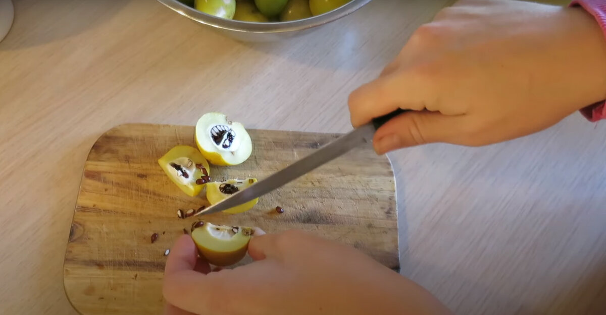 Для начала предварительно очищаем цидонию от косточек, затем нарезаем ее на небольшие кусочки.