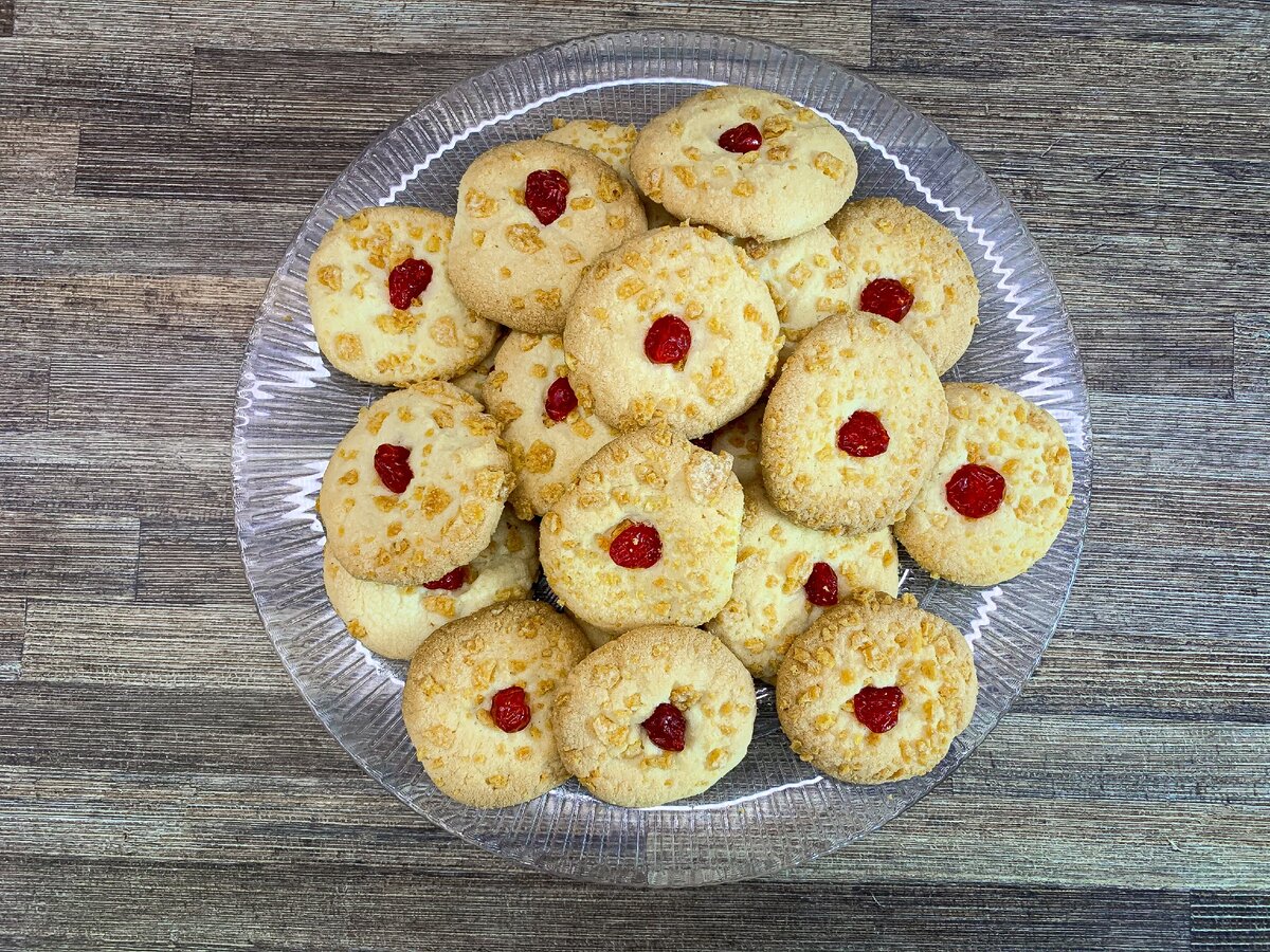 Вылепите из теста 24 шарика и обваляйте в кукурузных хлопьях. Выложите на застеленный пергаментом противень на достаточном расстоянии друг от друга. Слегка сплющите и посередине поместите вишенку.