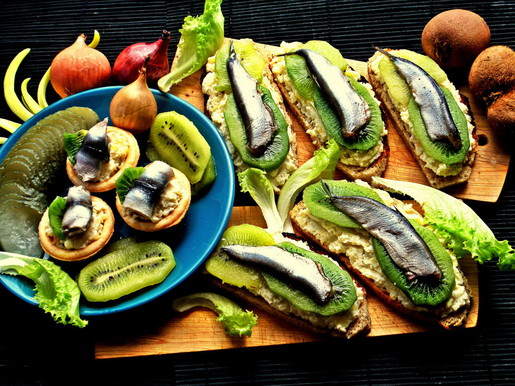 Для этого рецепта нам понадобится: нарезанной батон, банка икры мойвы подкопченной (я обычно покупаю с копченым лососем и сливочным сыром), шпроты, киви.