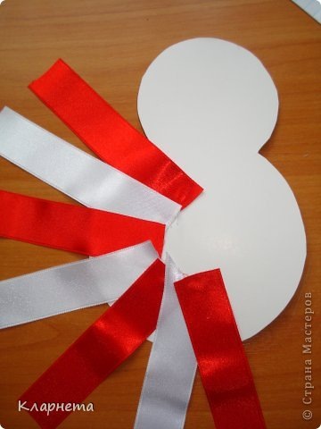 Для начала делаем основу нашей открытки. Вырезаем из картона восьмерку нужного нам размера. Приступаем к лентам: нарезаем несколько отрезков каждого цвета. Приклеиваем их на картон таким образом, как показано на фото. Их можно расположить абсолютно по-разному - здесь нужная только ваша фантазия.