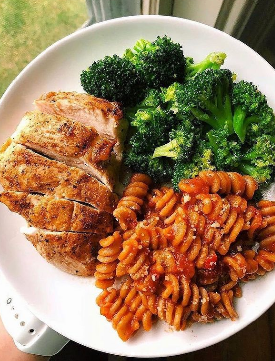 1. Куриная грудка, приправленная приправой, мясо/картофель. Запекается при температуре 400° около 25-30 минут + обжаренная брокколи + органический цельнозерновой фузилли, брошенный в приправу(укроп, петрушка, шпинат)и
