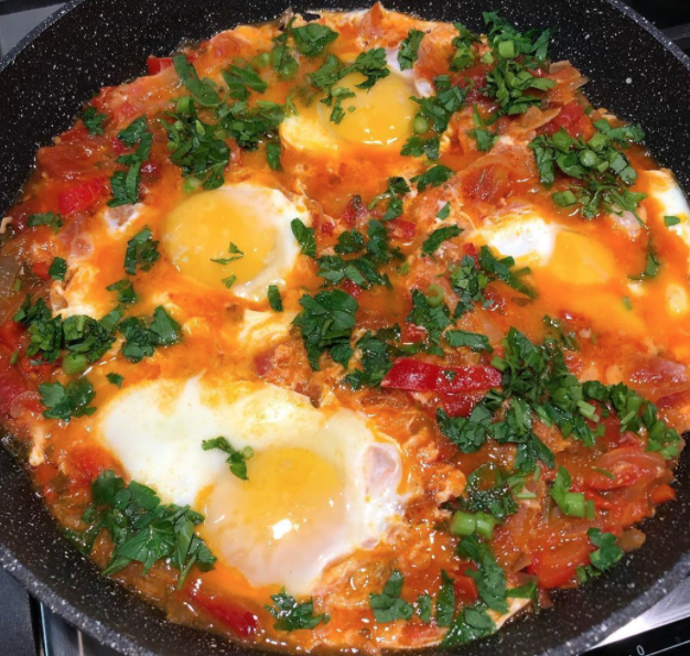 Делаем сильнее огонь и в приятно булькающий помидорный соус вбиваем по одному яйца, внимание! – в предварительно сделанные углубления ложкой (это важно).