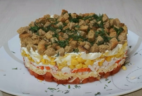 Берём нашу кукурузу и кладём её следующим слоем и снова делаем сеточку из майонеза.