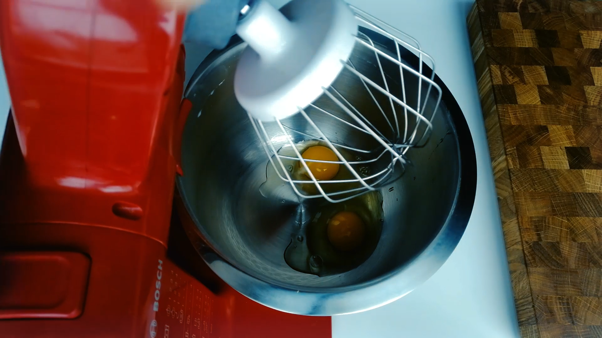 В это время нужно взбить 2 яйца до пены, можно использовать венчик, миксер или блендер. Чем вам удобнее и что проще мыть)